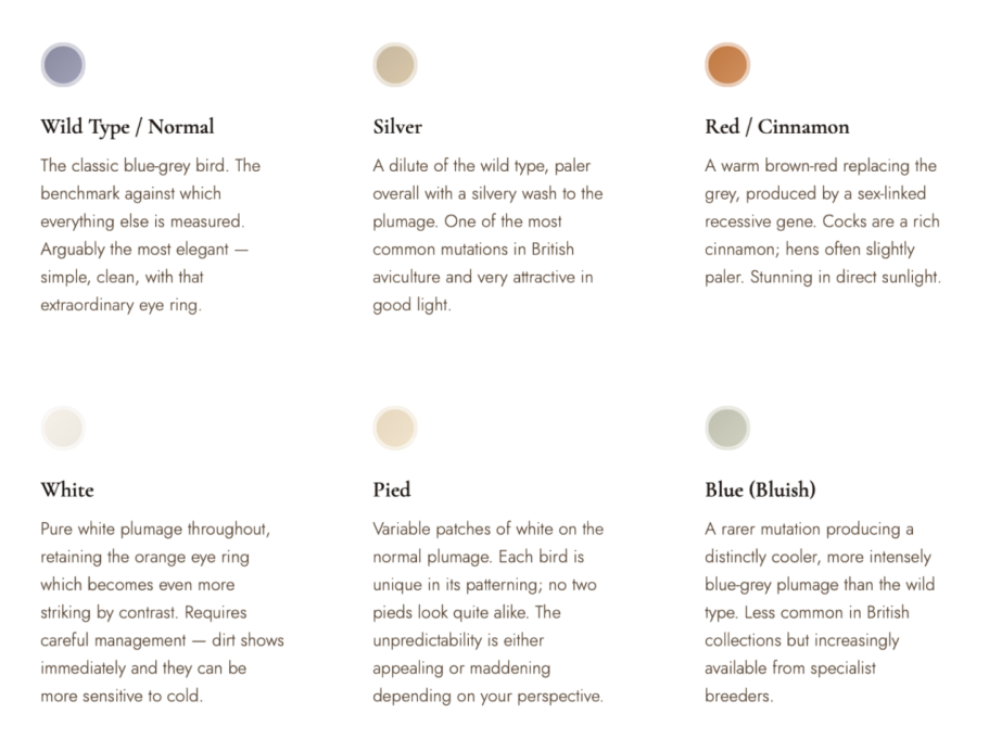 A note for newcomers: mutation terminology can be confusing because different countries and different breeders sometimes use different names for the same mutation. The names below are those most commonly used in British aviculture.
