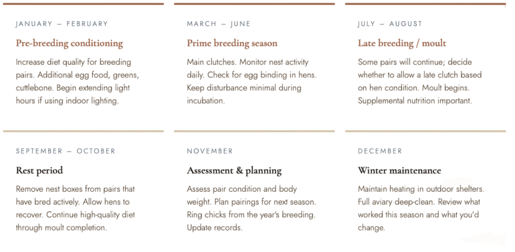 Diamond doves breed readily — possibly too readily. A fit, well-housed pair in good condition will attempt to breed almost year-round if you let them, cycling through clutches every five to six weeks. This sounds appealing until you realise that unrestricted breeding is hard on the hen, can produce poorly conditioned chicks, and results in young birds arriving faster than you can responsibly rehome them. Managing their breeding cycle is as important a skill as encouraging it in the first place.